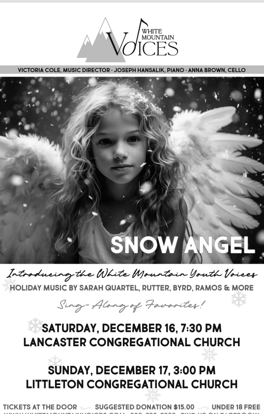 White Mountain Voices Choral Scholar Program – We invite high school students to join us! Up to 4 choral scholars per concert season will benefit from paid dues, music, 3 private voice lessons, and (as programming allows) opportunities for solo or small group work. Perfect for those who want to pursue studies in music education or performance.